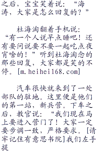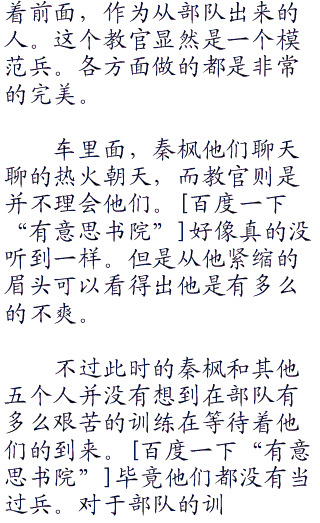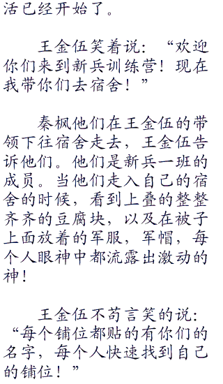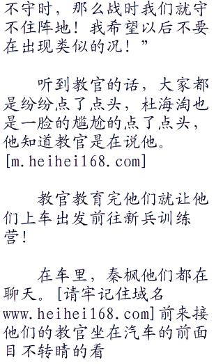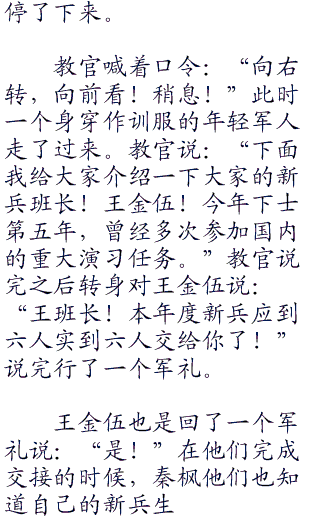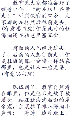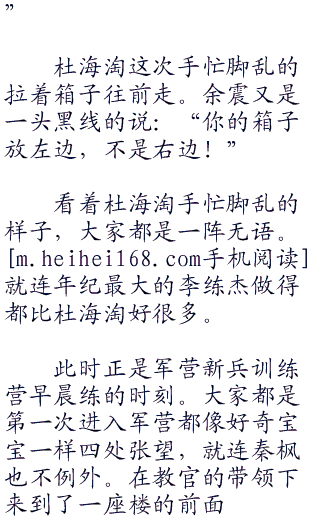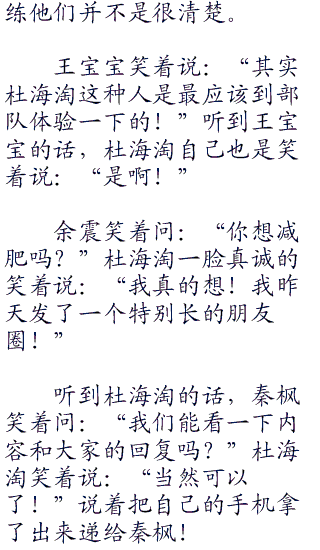 秦枫都有点无奈,不过现在节目已经开始了就只好走着看着了。不过看着杜海淘笨重的躯体和呆头呆脑的样子。秦枫第一次对自己的选择出现了动摇,或许杜海淘真的不适合这个节目。不过秦枫很快打消了这个念头,因为节目已经开始,他们已经上路了,踏上了他们的当兵之旅。