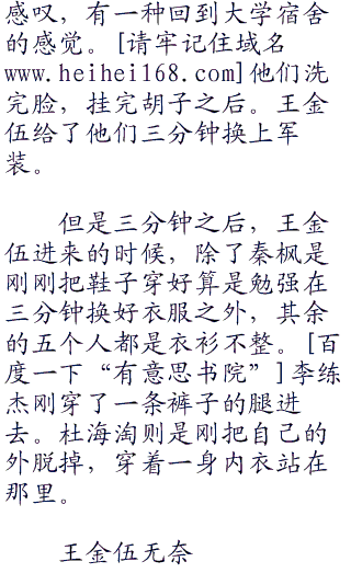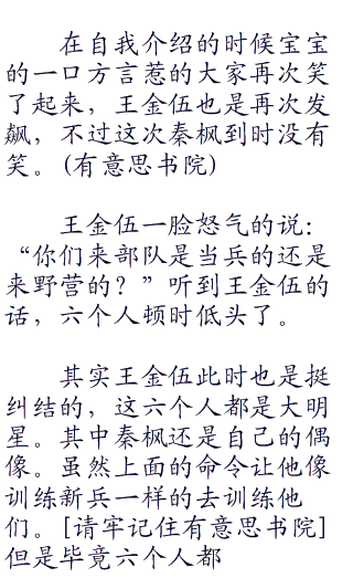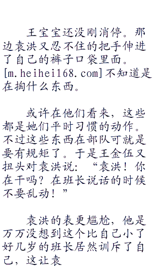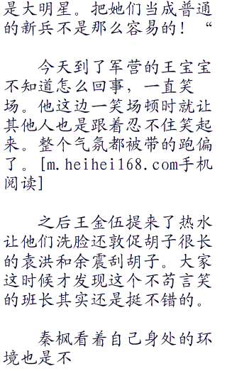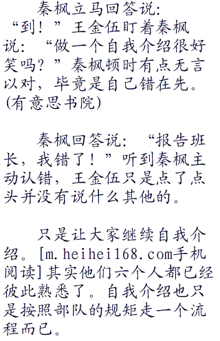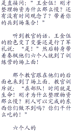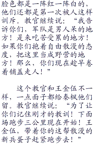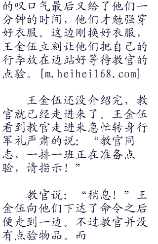 王金伍继续说:“王宝宝、袁洪为各自的排头!向左向右看齐!”听到王金伍的口令六个新兵迅速的执行着口令!