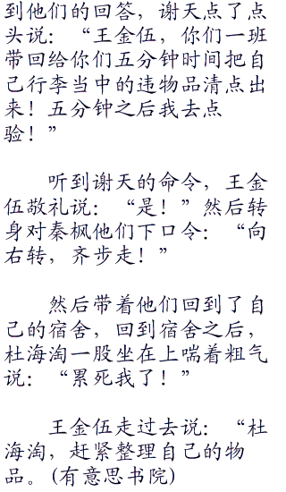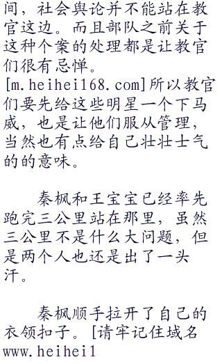 听到教官的话,秦枫和王宝宝只得加快脚步往前跑去。而王金伍作为班长依然陪跑杜海淘。显然教官并不是不近人,所以对王金伍的陪跑,教官并没有再去纠结。他们只是为了给这些明星一个下马威。