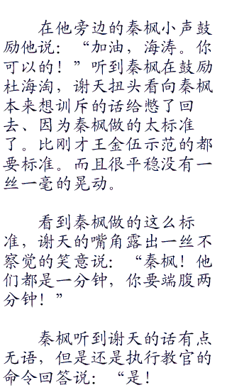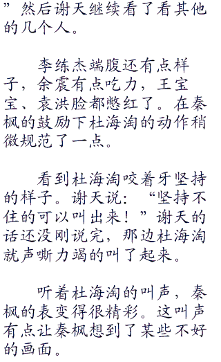 听到白燕这样说,baby才松了口气,不过baby还是担心的说:“你说枫哥会不会累?会不会受伤?”
