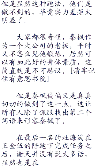 一直关注着秦枫的谢天也是越看越吃惊,秦枫的速度保持的很快,在部队中也是很少有人可以保持这么快的速度,而且这么快速的奔跑,在短时间内可以,但是时间一长绝对是要降低速度的,不然人的大腿肌是受不了的。