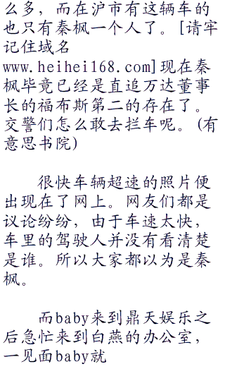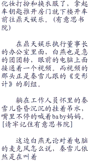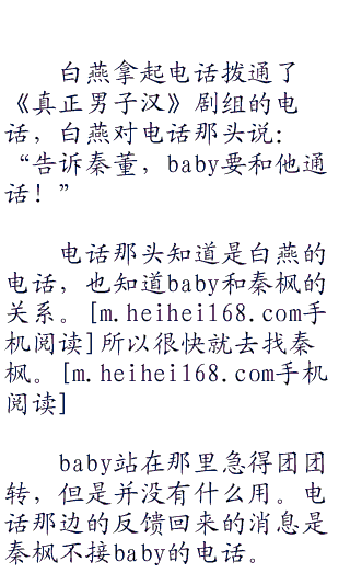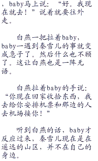 baby听到白燕的话毫不迟疑的说:“好,我现在马上去公司!”说完便把电话一扔一下子从上坐了起来。