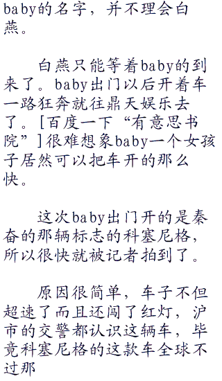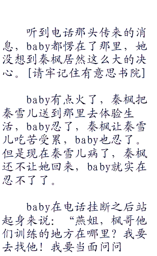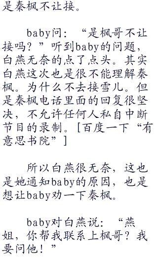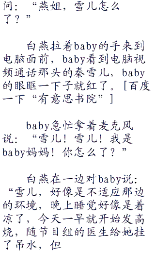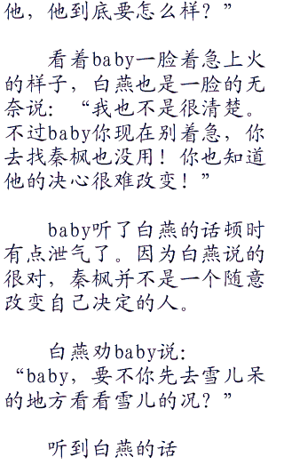 baby都要急哭了问:“雪儿,怎么了?燕姐!”听到baby着急的声音,白燕回答说:“三两句电话里面说不清楚,你赶快来公司!”