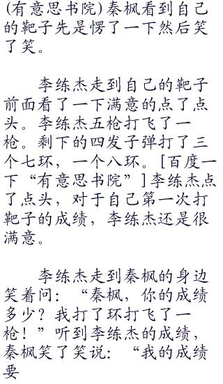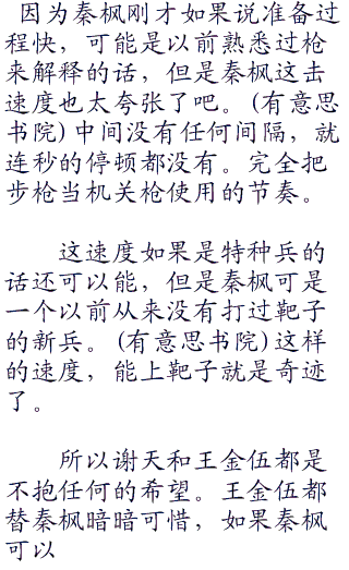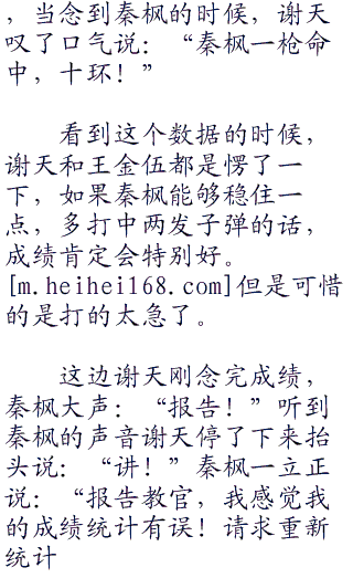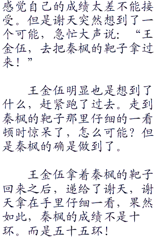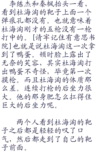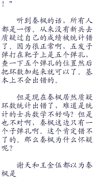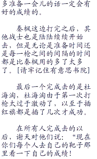 但是大家的阵阵议论并没有影响秦枫的状态。秦枫这边很稳健的打完了自己的子弹。然后微微一笑拿起手边的红色的小旗子插在了自己的靶位那里,示意自己已经完成了击。