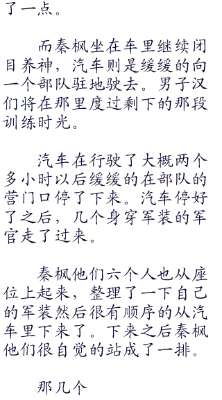 虽然尽管大家之前都是种种的不舍,但是这并不能阻止分别的到来。当秦枫他们坐上车离开军营的时候,秦枫他们每个人都是含着泪离开的。