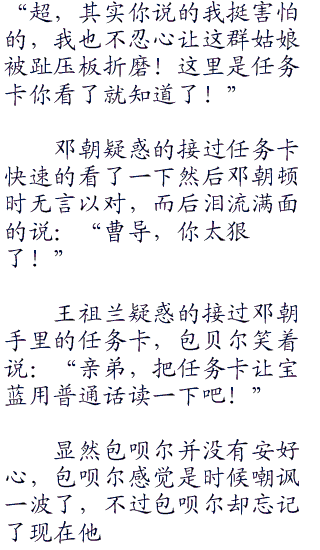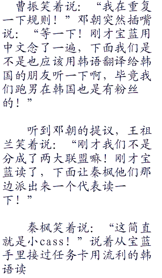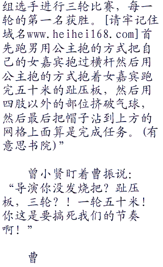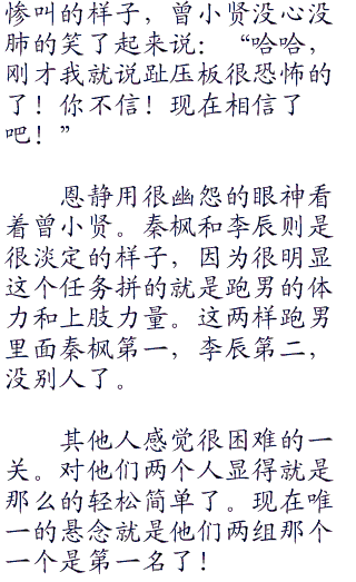 曾小贤大叫一声:“oh!no!为什么,为什么又是趾压板?”之前恩静让曾小贤跪过趾压板,但是恩静自己并没有体会过趾压板酸爽的滋味,所以恩静用很鄙视的眼神看着曾小贤,显然是嫌弃自己的搭档在还没有开始比赛就怂了的表现。