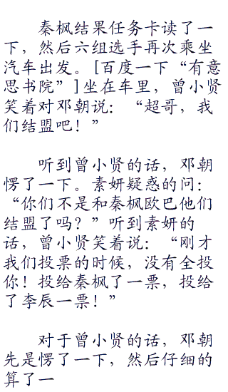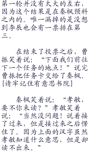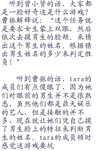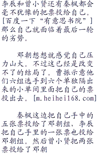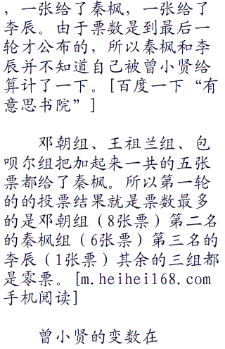 在三轮游戏结束之后,曹振笑着说:“这一轮比赛的结果是第一名是秦奋和朴孝敏获得五张票。第二名是曾小贤和含恩静获得四张票,第三名邓朝和朴素妍获得三张票,李辰和朴智妍、王祖兰和全宝蓝、包呗尔和李居丽各获得一张票!下面开始进入投票环节!”