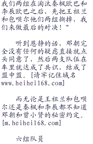 前两轮秦枫和孝敏,曾小贤和恩静顺利拿到了第一和第二名。第三轮在王祖兰和包呗尔两组的夹击之下,李辰显然是不可能完成任务的。在没有任何竞争压力的况下,邓朝和素妍顺利完成任务成为了第三名。