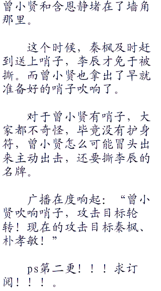 不过刚才还真是李辰和朴智研救了秦枫和晓敏。刚才那个哨子就是李辰和朴智研找到的。而恰好在包呗尔和李居里堵到秦枫的时候,把哨子交给了秦枫。不然的话,不能反抗的秦枫估计就要被包呗尔叫来邓朝给围堵在这里。