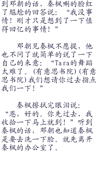 桌子上的咖啡渐渐的凉了,秦枫的眼睛也在不知不觉中被泪水模糊的视线。就在秦枫陷入回忆当中的时候。办公室的门被推开了,“秦枫,那个我们的舞蹈还是学不会!你来教一下!”进来的是邓朝。