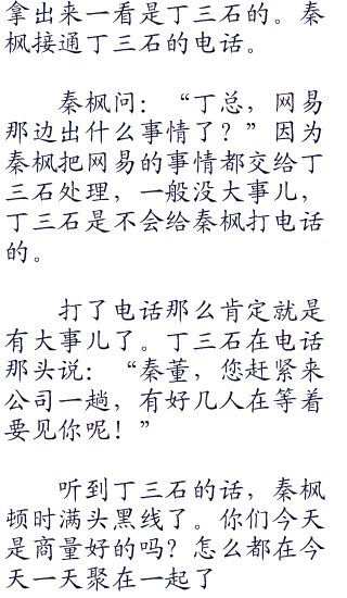 大家都在想着自己校园时代的回忆,所以大家也都没怎么聊天就各自回房间睡觉了。第二天一大早,秦枫就被电话吵醒了。