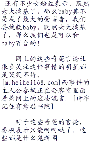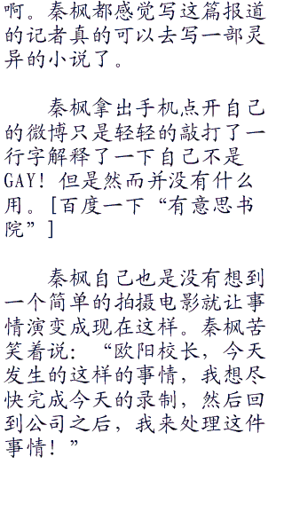 一时间网上各种议论都冒了出来。那感觉就好想法仿佛秦枫自己承认自己是gay了一样,什么样的评论都冒了出来。