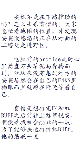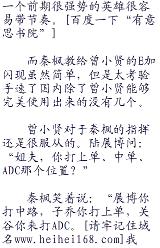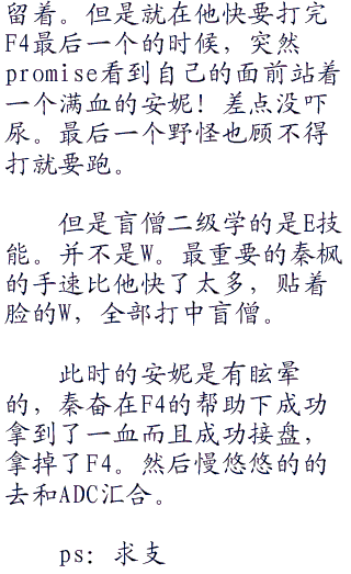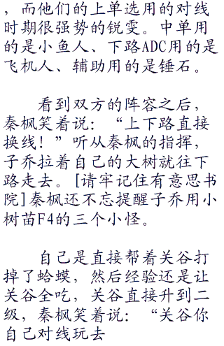 baby跃跃欲试的说:“枫哥,要不要我来打adc啊!”秦枫笑着说:“对付这帮小p孩儿那里用麻烦你出手啊!看我如何教育他们做人!”