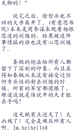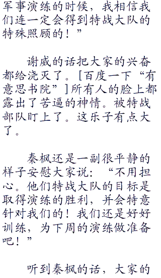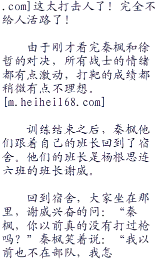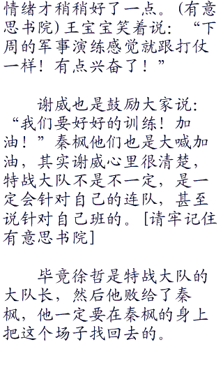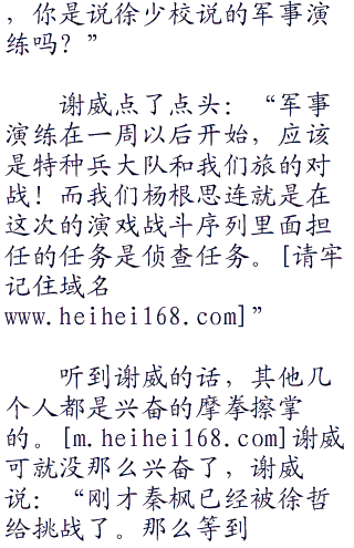 徐哲板着脸走到秦枫的面前,显然这次的失败并不能让徐哲服气。徐哲说:“秦枫,今天是你赢了!我输了!不过我可不会这么轻易就认输的!还有一周时间就是军事演练。当时候我们在决胜负!”
