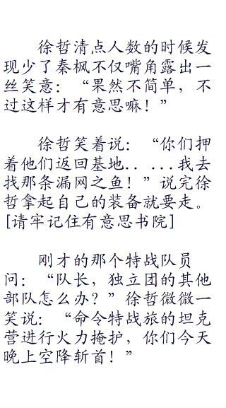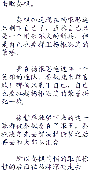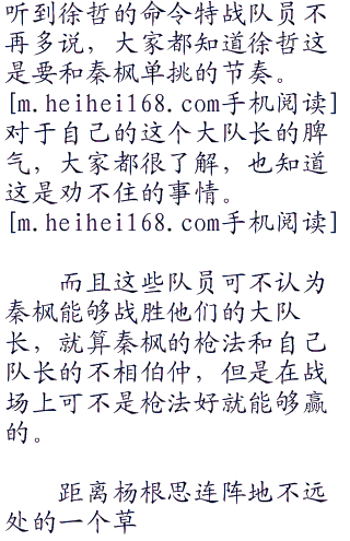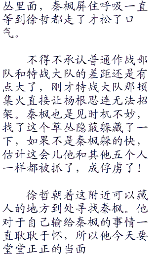 军事演习就是在这样没有任何预兆的情况下开始了。谢威大声的说:“秦枫你们六个跟好我!”说着谢威向前跑去,秦枫他们六个人就是紧紧的跟在谢威的身后。