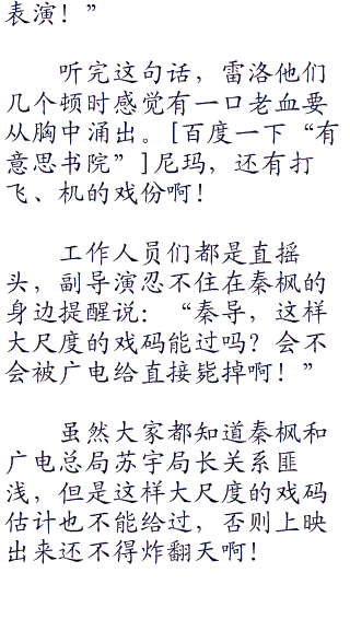 这样的戏份其实并不难,所以几个人很简单的就通过。听到秦枫说通过的时候,几个演员都是松了口气,虽然平时打飞、机这种事情他们做过,但是在镜头面前当着这么多工作人员的面,还是感觉压力山大。