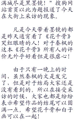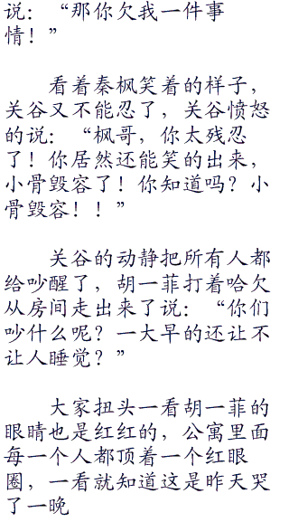 关谷神奇哽咽着说:“就是小说,你就可以这样吗?你居然把小骨给毁容了!那么清纯可爱的女孩子!你就这么给毁了!”关谷如同念念碎一般就是记住了秦枫把花千骨给写毁容了!