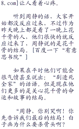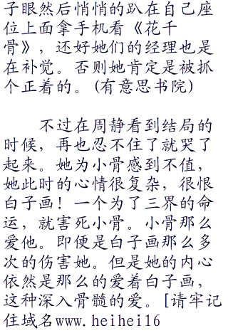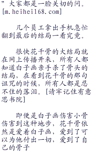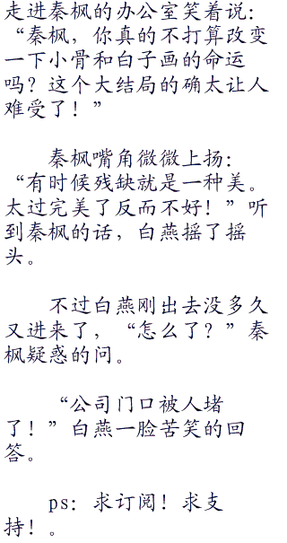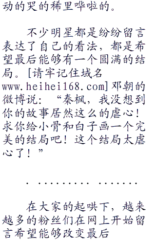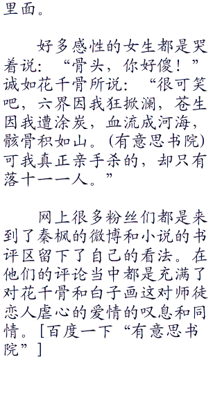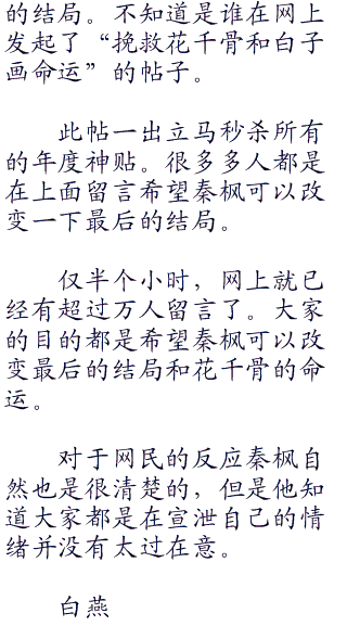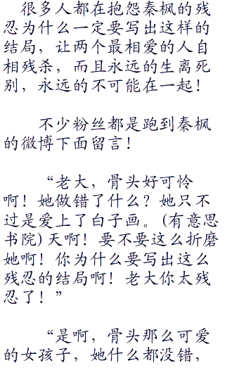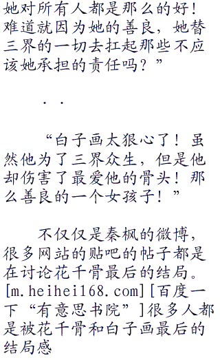 不过显然大家都是想的很美好,现实却是很残酷的。看到网友们在网上的留言,秦枫一脸的苦笑,因为《花千骨》最后的大结局是花千骨死在了白子画的手上,而且在白子画想要和她一起死的时候,花千骨却立下了:“白子画,我以神的名义诅咒你,今生今世,永生永世,不老不死,不伤不灭!”的誓言。