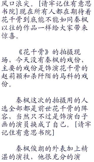 在大家猜疑的同时,秦枫则是全封闭的拍摄《花千骨》这一次的封闭比以往任何一次都严。媒体们是一点消息都得不到。