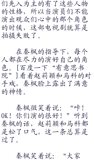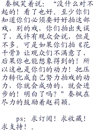秦枫只是简单的举行了一下通俗的开机仪式然后就开始拍摄了。经过这次的事件,大家都很能理解秦枫,很珍惜这次的机会。