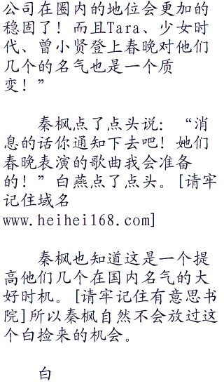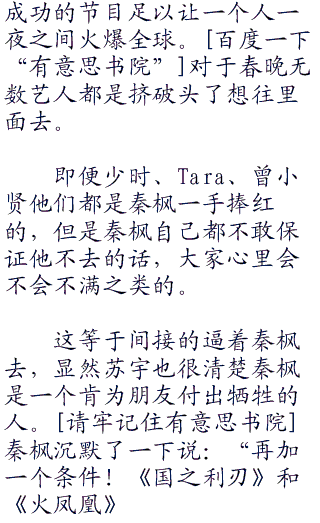 秦枫心里也是暗骂了一声。央视这招很损。如果秦枫不去春晚的话,那么tara、少女时代、曾小贤一个都去不了。