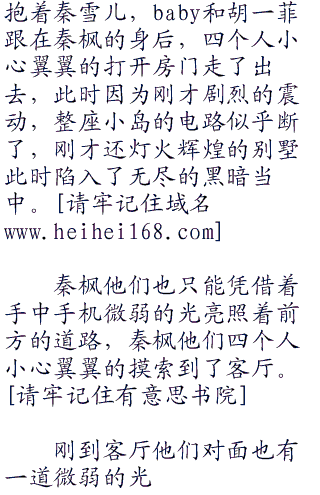 秦枫刚要起身起来,baby拽着秦枫的衣角小声说:“枫哥,我怕!”看着一脸恐惧表情的baby她们。秦枫拉着她们的手说:“好吧!你们跟紧我!我们一起出去看看!”