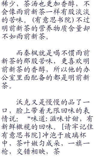 沃克端起茶水轻轻的喝了一口然后微闭着眼睛摇晃着脑袋似乎真的是在品茶一样。沃克晃了两圈脑袋睁开眼睛微微一笑说:“明前新茶,果然名不虚传!”