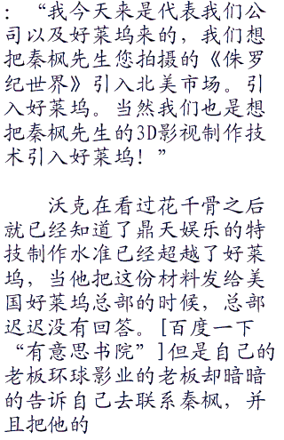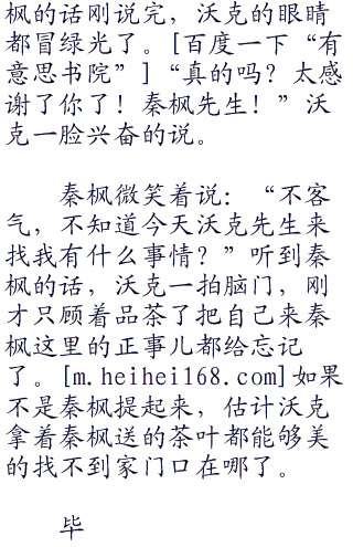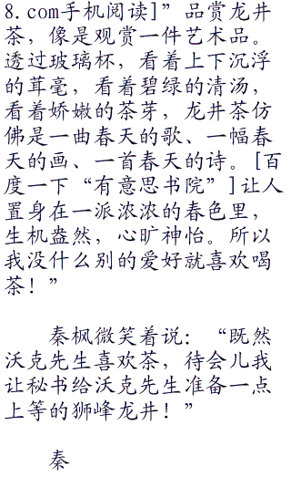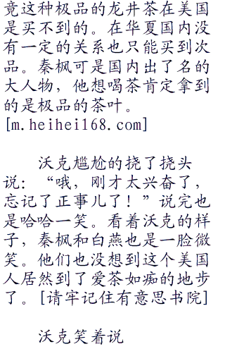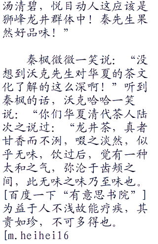 秦枫微笑着说:“沃克先生,这是我们华夏的名茶杭州龙井!你尝尝!”沃克面带微笑的对白燕说了一声:“谢谢!”接过茶叶,笑着说:“早就听说华夏的茶叶以龙井为贵!今天我要好好打的品一品差了!”