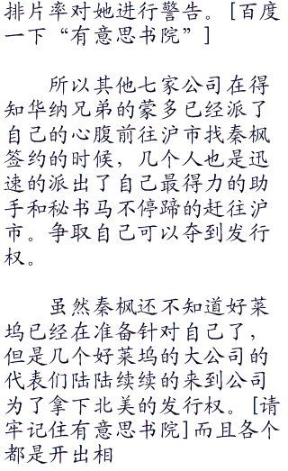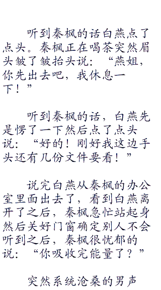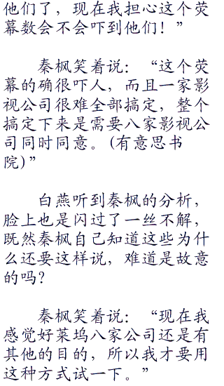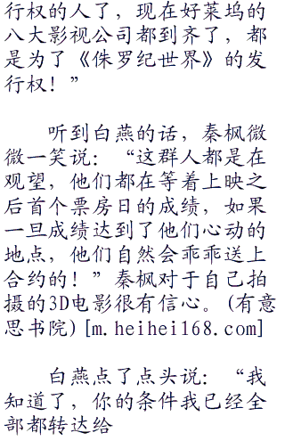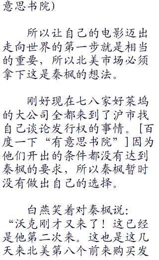 白燕在送走了沃克之后也离开自己的办公室径直走向秦枫的办公室,刚才其实秦枫也是在公司的,只是他故意不和这些好莱坞的影视公司的人见面的。