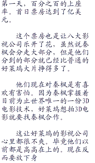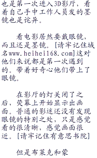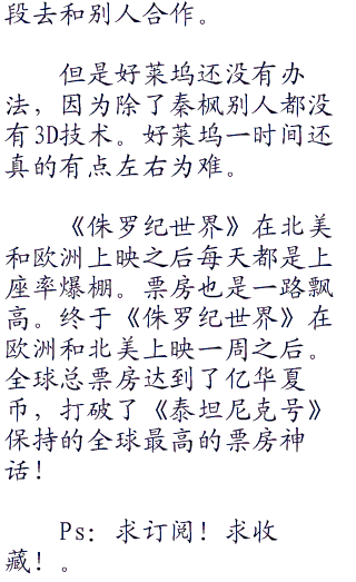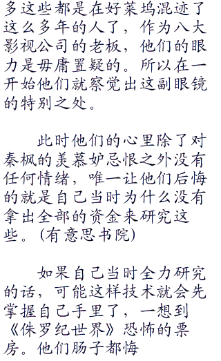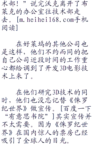 布莱克最后心烦的说:“算了!我们先把这部电影的成本收回来再说!然后告诉技术部门抓紧时间进行3d技术的研究!”