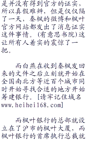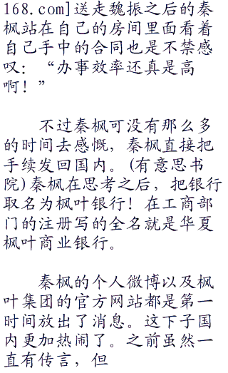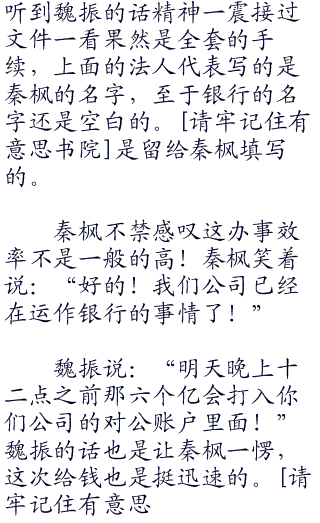 魏振随意的接过合同看也没看,又从自己的公文包里面掏出一份文件递给秦枫说:“秦先生,这是银监会开出的所有手续,现在你就可以光明正大的开银行了!”