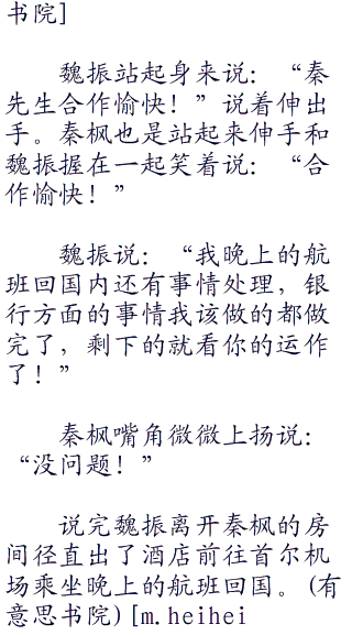 魏振在秦枫对面的沙发上坐下翘着二郎腿悠哉的问:“秦先生,合同你感觉怎么样?”秦枫笑着说:“我已经签字了!”说着秦枫把合同递给魏振。