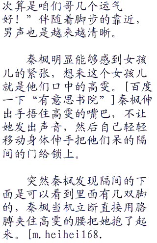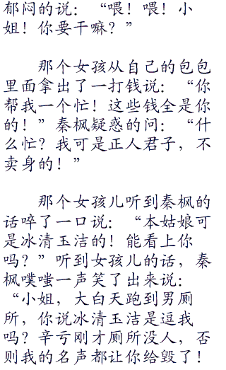看到女孩跑得方向,秦枫急忙一把拽住了她,女孩很着急的说:“你拽我干嘛?撒手!”