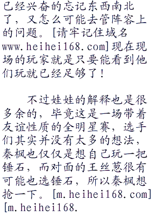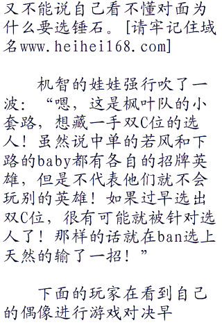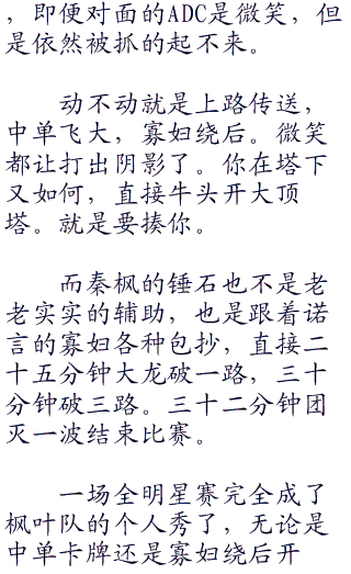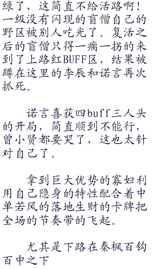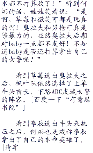 诺言和若风还没有开口,秦枫笑着说:“辰儿,帮我抢个锤石吧!”听到秦枫的话,李辰点了点头直接秒锁了锤石。因为他们都已经一起练习了很多场比赛,秦枫的锤石一直是让人很恶心的一个位置。