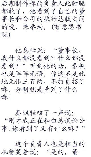 就在两个人相顾无言,深情脉脉的互相对望的时候,后期制作部的负责人从部门里面跑了出来一边跑一边喊:“白总!白总!”