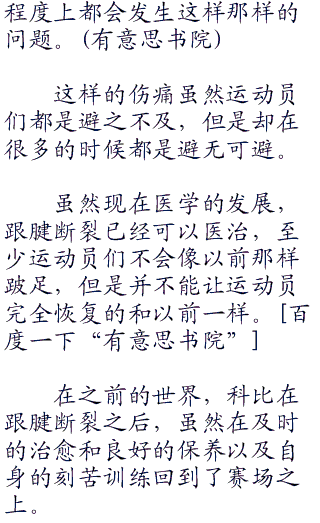 吕子乔点了点说:“今天nba湖人队比赛的时候,第三节科比意外受伤,根据初步检测有可能是跟腱断裂!”
