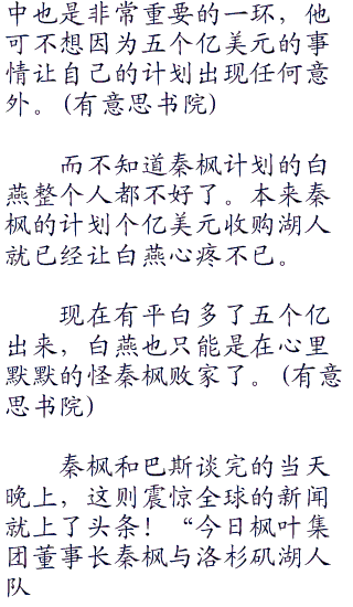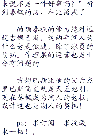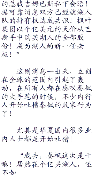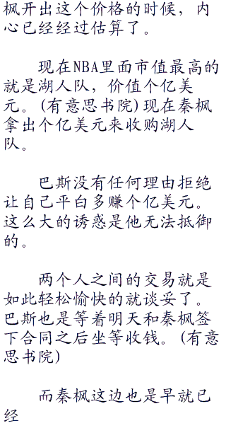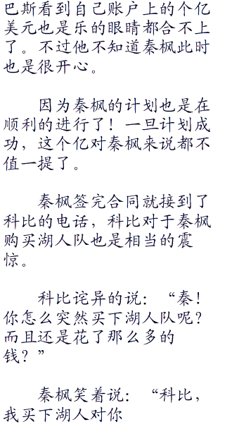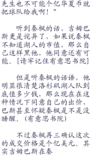 秦枫笑着说:“当然,我也没说是个亿华夏币!以洛杉矶湖人队现在价值个亿的市值,巴斯