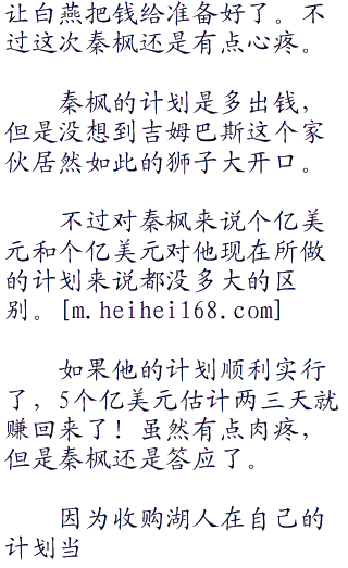 秦枫看着吉姆巴斯说:“吉姆先生,你开的价格我完全接受!我明天会让人把合同拟定好!然后我会直接去你的公司找你的!”