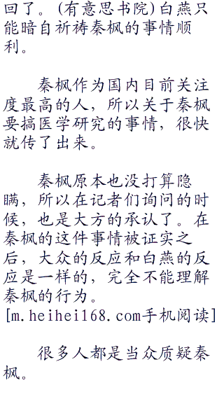 白燕急忙说:“秦枫,我没听错吧!你要去搞医学研究?”