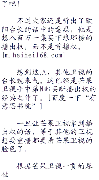 芒果卫视的欧阳台长笑着说:“之前《花千骨》那部电视剧我们芒果卫视的首播权是一集四百万!后来又加了两百万买断了《花千骨》的播出权!这次我开出八百万一集的价格拿下《琅琊榜》的播出权!”