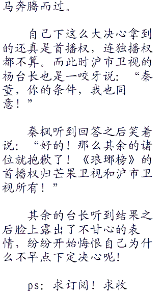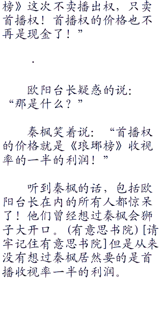听到秦枫提到琅琊榜首播权的话题了,这些个台长一个比一个有精神,生怕自己错过秦枫的说的每一个字。