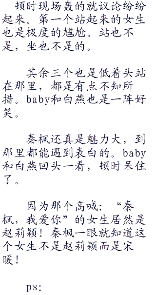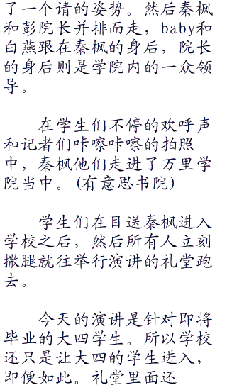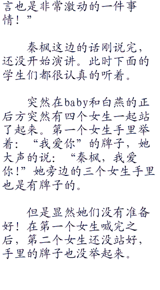白燕回过头说:“喂,不要打情骂俏了!秦枫,你的演讲准备的怎么样啊?”