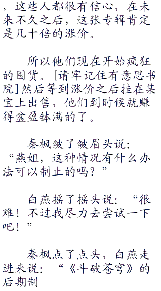 白燕来到秦枫的办公室无奈的说:“不行了!你的专辑已经预售的太多了,现在制作不出来那么多。”