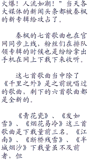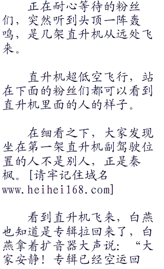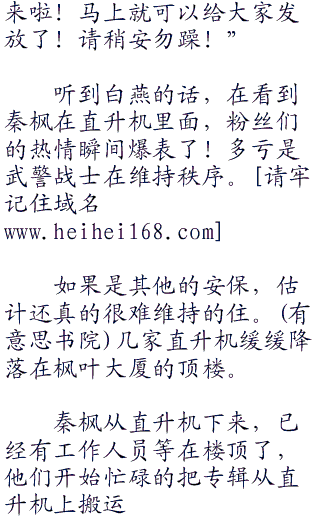秦枫对白燕说:“燕姐,你现在去联系市政府,让他们派武警前来维持秩序!我现在去南航公司乘坐飞机把专辑带到枫叶大厦。”