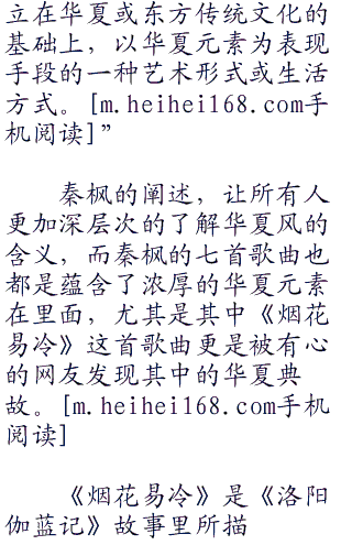 而秦枫在接受采访的时候也是再次阐述了自己关于华夏风的认知:“华夏风即华夏风格。它是以华夏元素为表现形式,建立在华夏文化和东方文化的基础上,并适应全球经济发展趋势的有着自身独特魅力和性格的艺术形式。华夏风格即华夏文化的风格或风尚。华夏风格是建