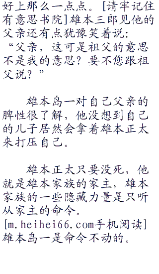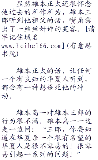 说完这句话,雄本三郎眼中的杀气更胜了。雄本正太满意的看了看自己的孙子,又不满的看了看自己的儿子。