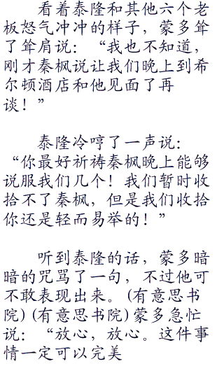 刚才的注意又是自己提出来的,如果不能够给他们有个交代的话,蒙多很清楚其余的七个老板肯定要把怒火发泄在自己的身上。