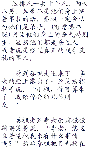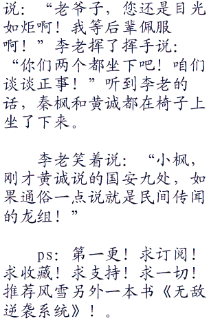 听到李老的话,秦枫疑惑的问:“京城来人了?是上面派来的吗?”李老笑了笑说:“你不是念念不忘那个老鬼子的命吗?这是我从上面找来的帮手!”