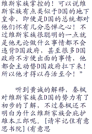 黄诚看着秦枫脸上露出的一丝疑惑解释说:“维斯是维斯家族的现任家主。维斯家族控制了d国超过百分之三十的经济,同时d国的黑道势力全部都是