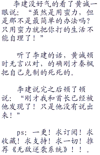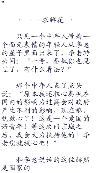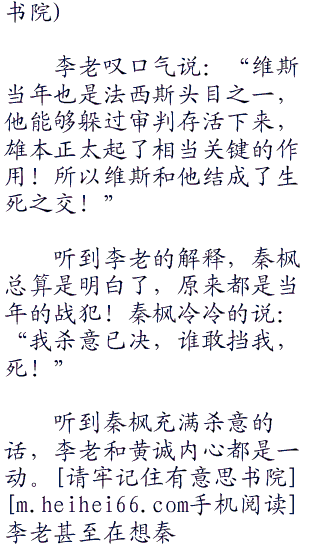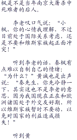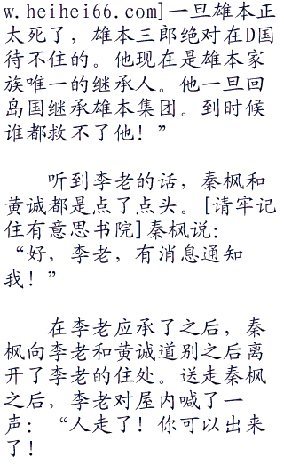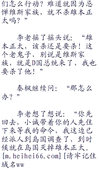 秦枫和黄诚达成协议之后,李老说:“小枫、小诚现在岛国那边的形式还不太明朗,雄本正太那个老鬼子把他的孙子雄本三郎送到了d国。在一个叫维斯的人那里!”